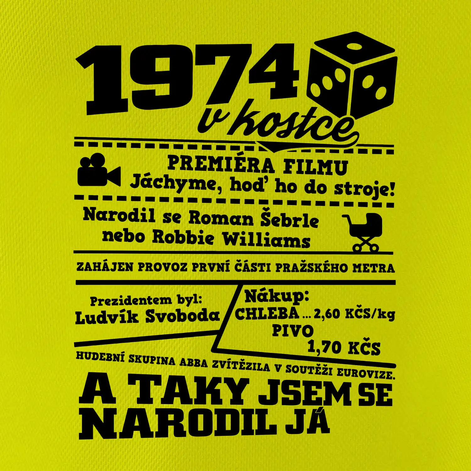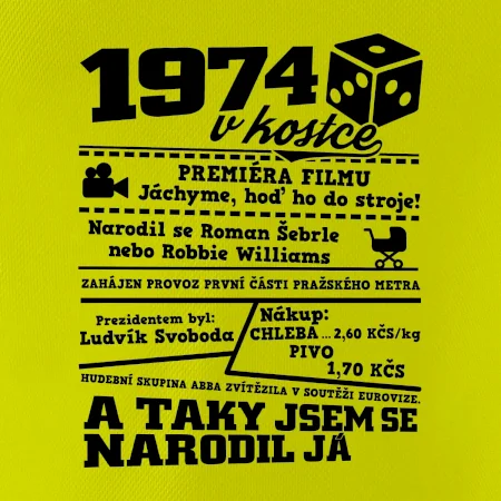 Narozeninové tričko pro ročník 1974. Sháníš originální dárek? Triko pro ročník 1974 v kostce je ten nejlepší dárek, kterým jistě potěšíš. Kolik co stálo? Kdo byl prezident? Kdo se narodil? Všechno tohle a ještě mnohem víc najdeš na našem oslaveneckém triku!
