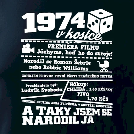 Narozeninové tričko pro ročník 1974. Sháníš originální dárek? Triko pro ročník 1974 v kostce je ten nejlepší dárek, kterým jistě potěšíš. Kolik co stálo? Kdo byl prezident? Kdo se narodil? Všechno tohle a ještě mnohem víc najdeš na našem oslaveneckém triku!