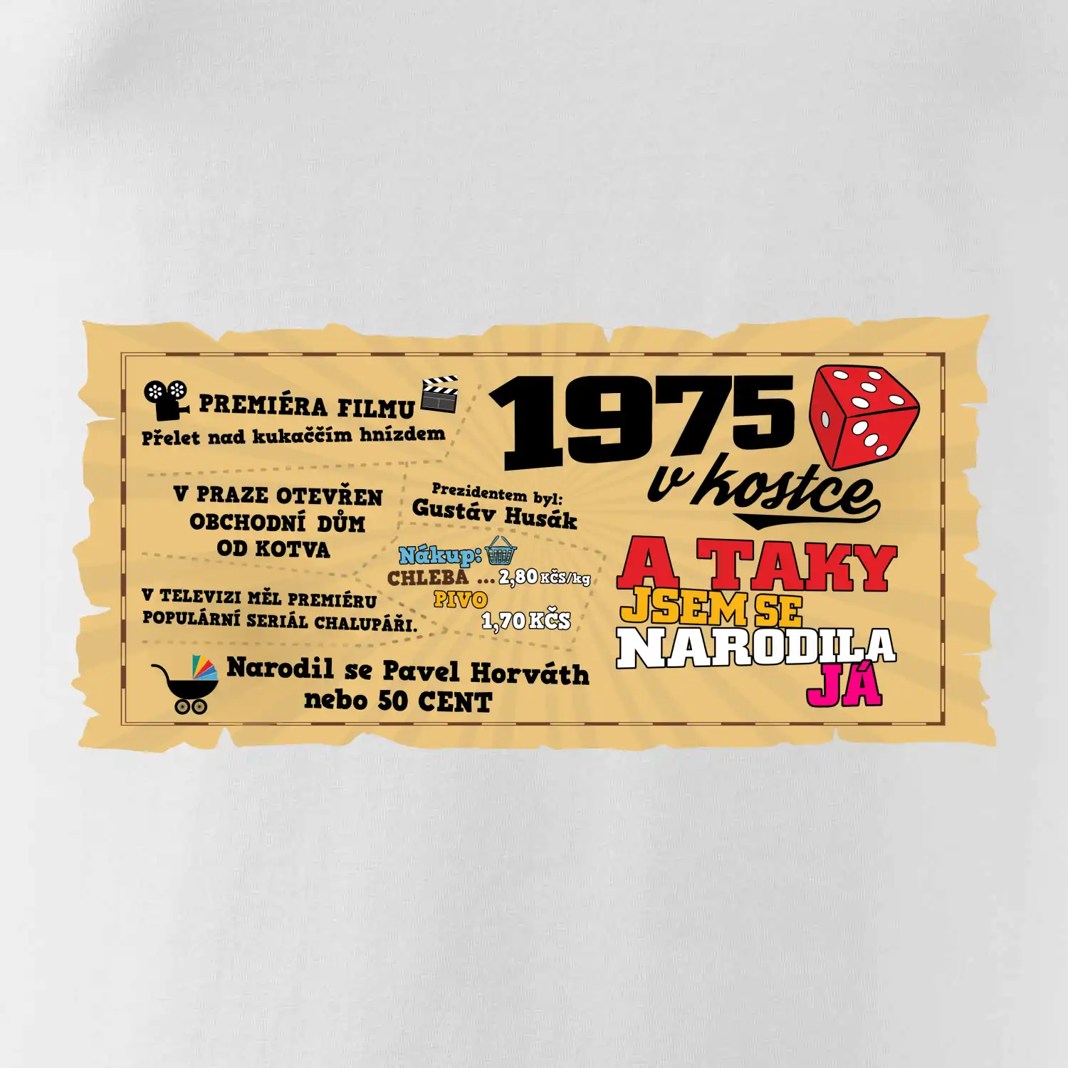 Polštář nebo taška "1975 v kostce" je stylovým způsobem, jak vyjádřit svou lásku k historickému roce 1975 a událostem, které se v té době udály. Toto tričko je vyrobeno z kvalitního materiálu, který je pohodlný na nošení po celý den. Jeho výrazný design zahrnuje významné události a nápisy spojené s rokem 1975, které jsou umístěny na přední straně.