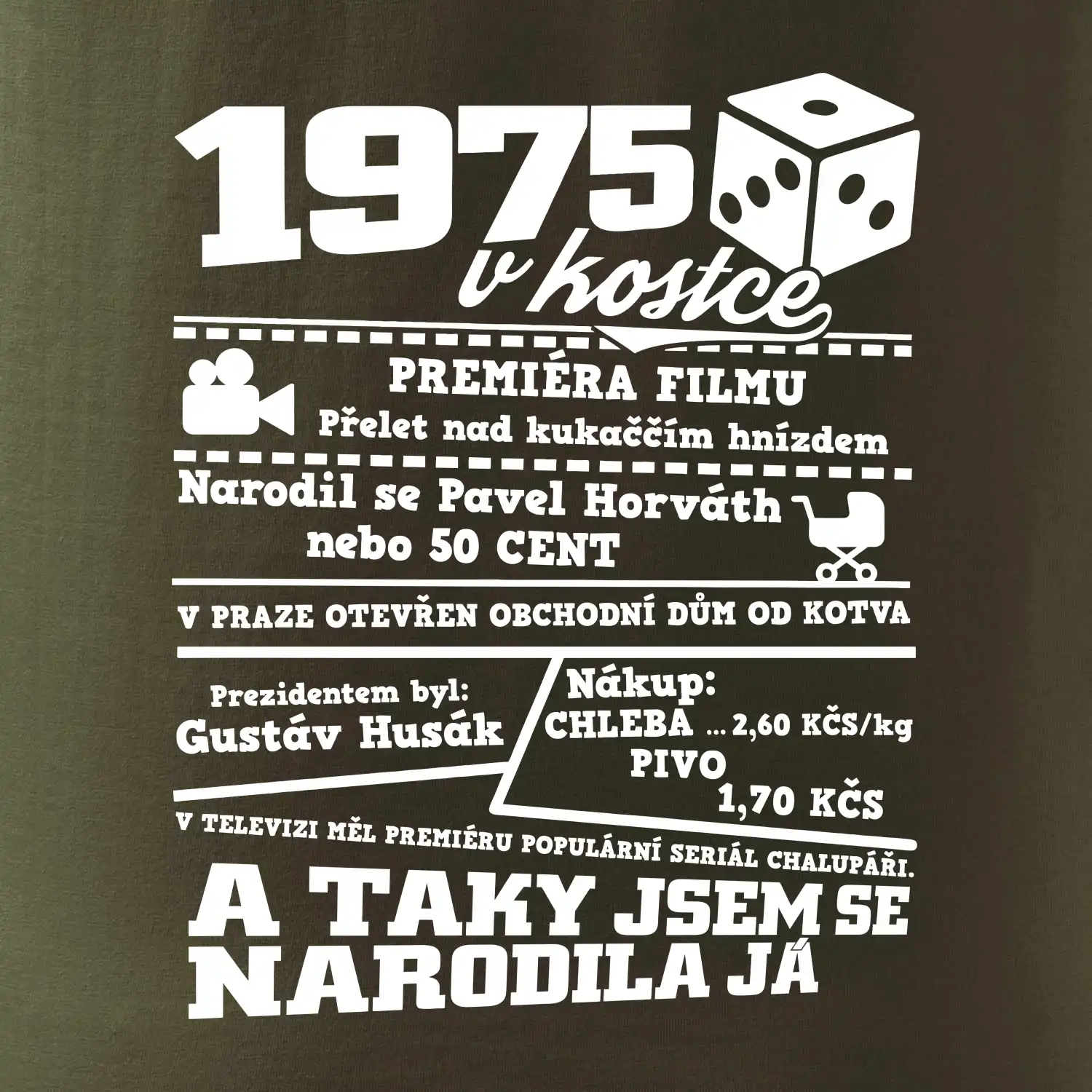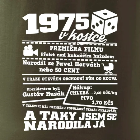 Narozeninové tričko pro ročník 1975. Sháníš originální dárek? Triko pro ročník 1975 v kostce je ten nejlepší dárek, kterým jistě potěšíš. Kolik co stálo? Kdo byl prezident? Kdo se narodil? Všechno tohle a ještě mnohem víc najdeš na našem oslaveneckém triku!
