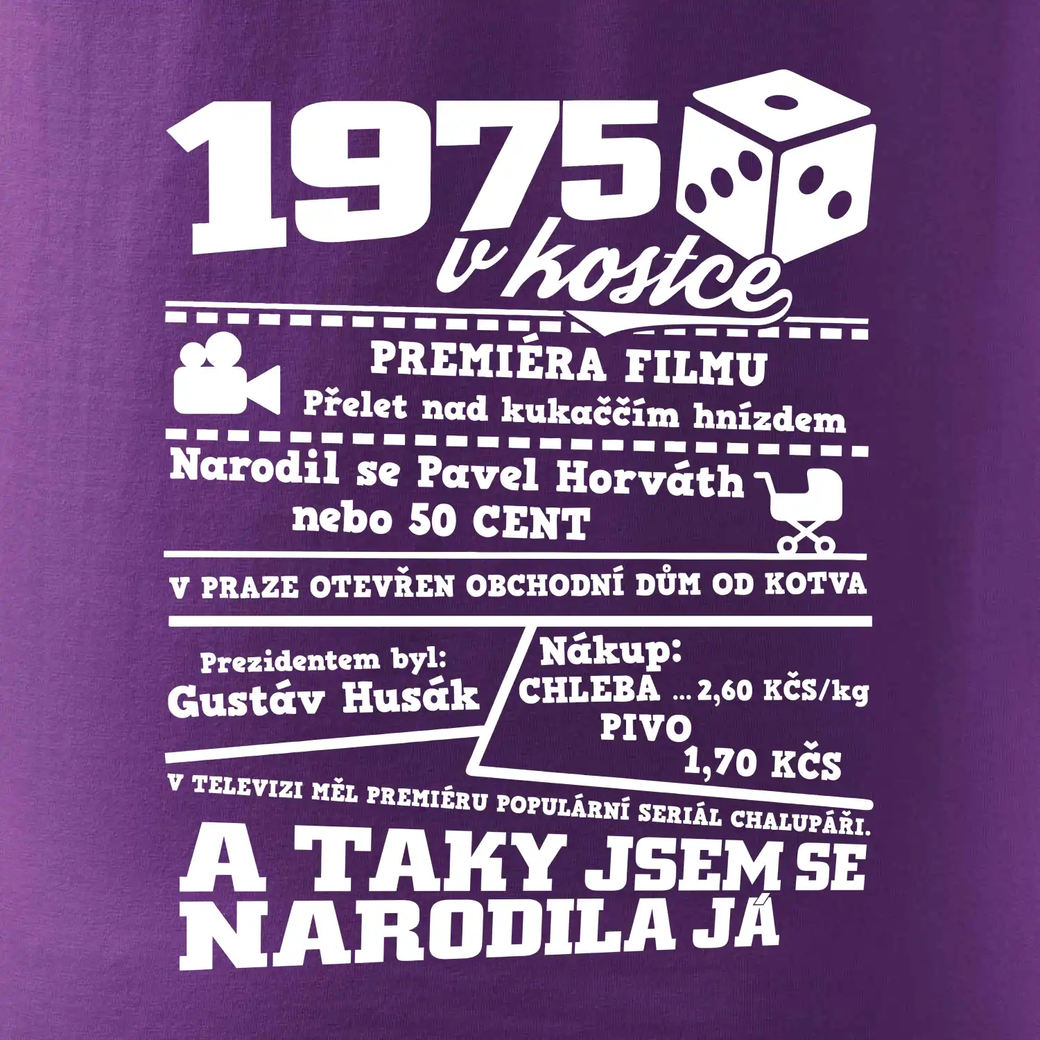 Narozeninové tričko pro ročník 1975. Sháníš originální dárek? Triko pro ročník 1975 v kostce je ten nejlepší dárek, kterým jistě potěšíš. Kolik co stálo? Kdo byl prezident? Kdo se narodil? Všechno tohle a ještě mnohem víc najdeš na našem oslaveneckém triku!