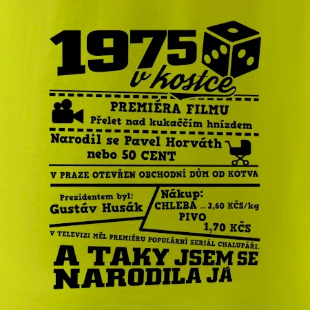 Narozeninové tričko pro ročník 1975. Sháníš originální dárek? Triko pro ročník 1975 v kostce je ten nejlepší dárek, kterým jistě potěšíš. Kolik co stálo? Kdo byl prezident? Kdo se narodil? Všechno tohle a ještě mnohem víc najdeš na našem oslaveneckém triku!