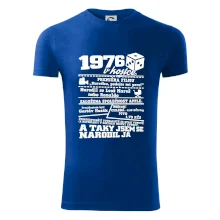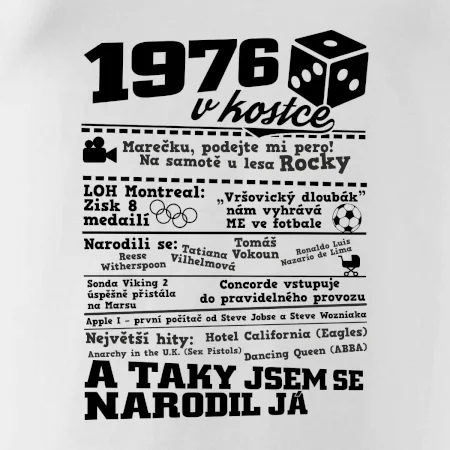 Narozeninové tričko pro ročník 1976. Sháníš originální dárek? Triko pro ročník 1976 v kostce je ten nejlepší dárek, kterým jistě potěšíš. Kolik co stálo? Kdo byl prezident? Kdo se narodil? Všechno tohle a ještě mnohem víc najdeš na našem oslaveneckém triku!