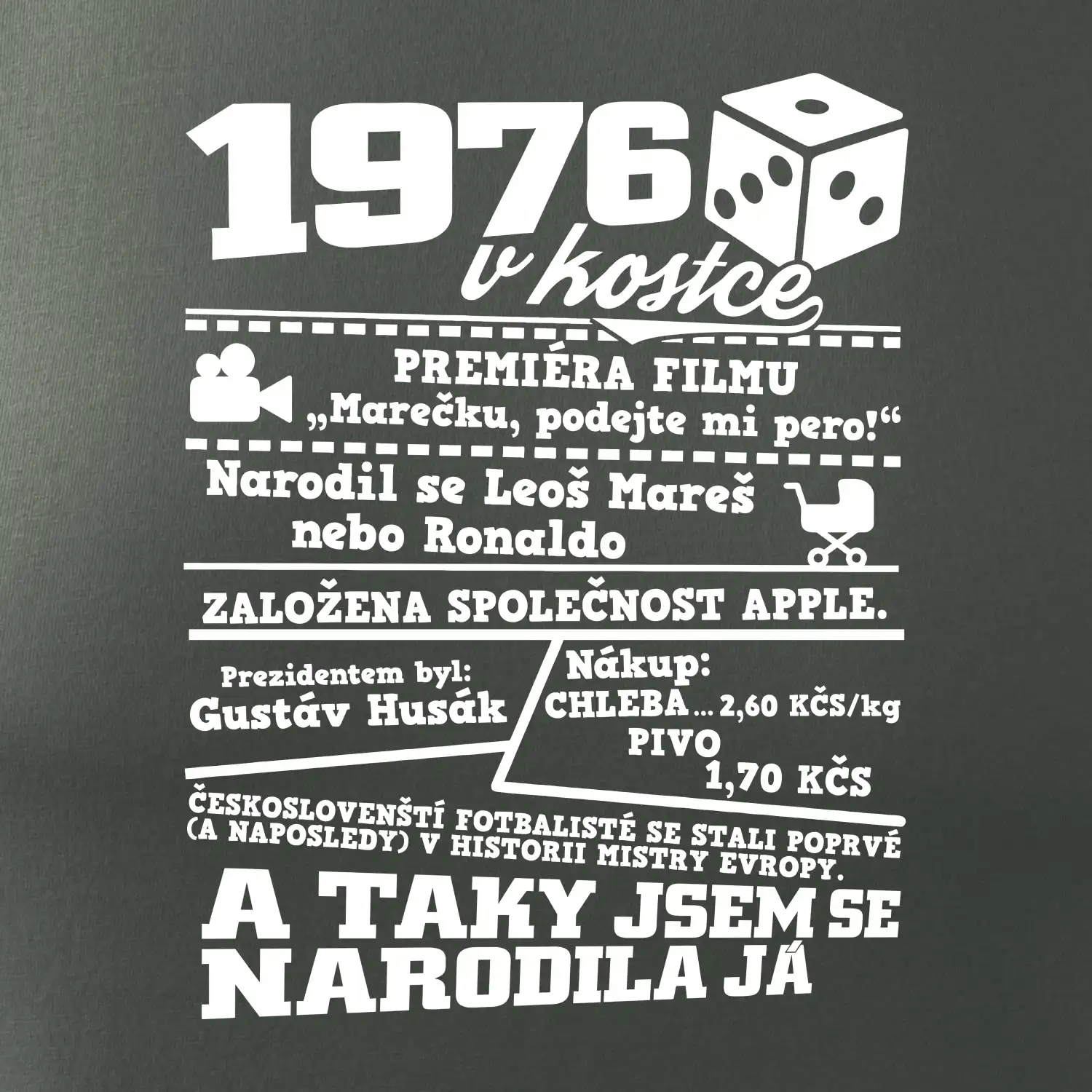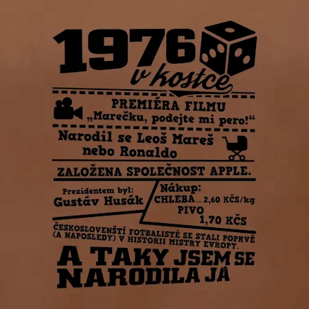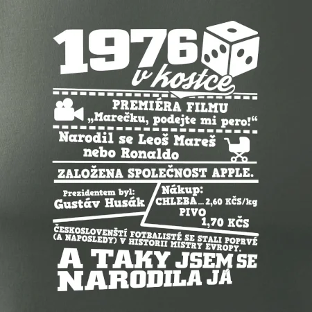 Narozeninové tričko pro ročník 1976. Sháníš originální dárek? Triko pro ročník 1976 v kostce je ten nejlepší dárek, kterým jistě potěšíš. Kolik co stálo? Kdo byl prezident? Kdo se narodil? Všechno tohle a ještě mnohem víc najdeš na našem oslaveneckém triku!