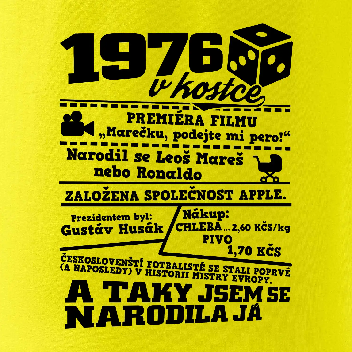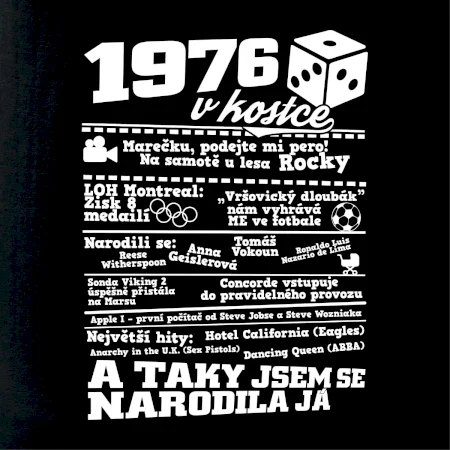 Narozeninové tričko pro ročník 1976. Sháníš originální dárek? Triko pro ročník 1976 v kostce je ten nejlepší dárek, kterým jistě potěšíš. Kolik co stálo? Kdo byl prezident? Kdo se narodil? Všechno tohle a ještě mnohem víc najdeš na našem oslaveneckém triku!