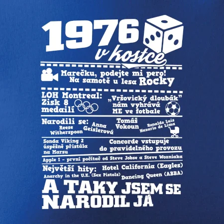 Narozeninové tričko pro ročník 1976. Sháníš originální dárek? Triko pro ročník 1976 v kostce je ten nejlepší dárek, kterým jistě potěšíš. Kolik co stálo? Kdo byl prezident? Kdo se narodil? Všechno tohle a ještě mnohem víc najdeš na našem oslaveneckém triku!