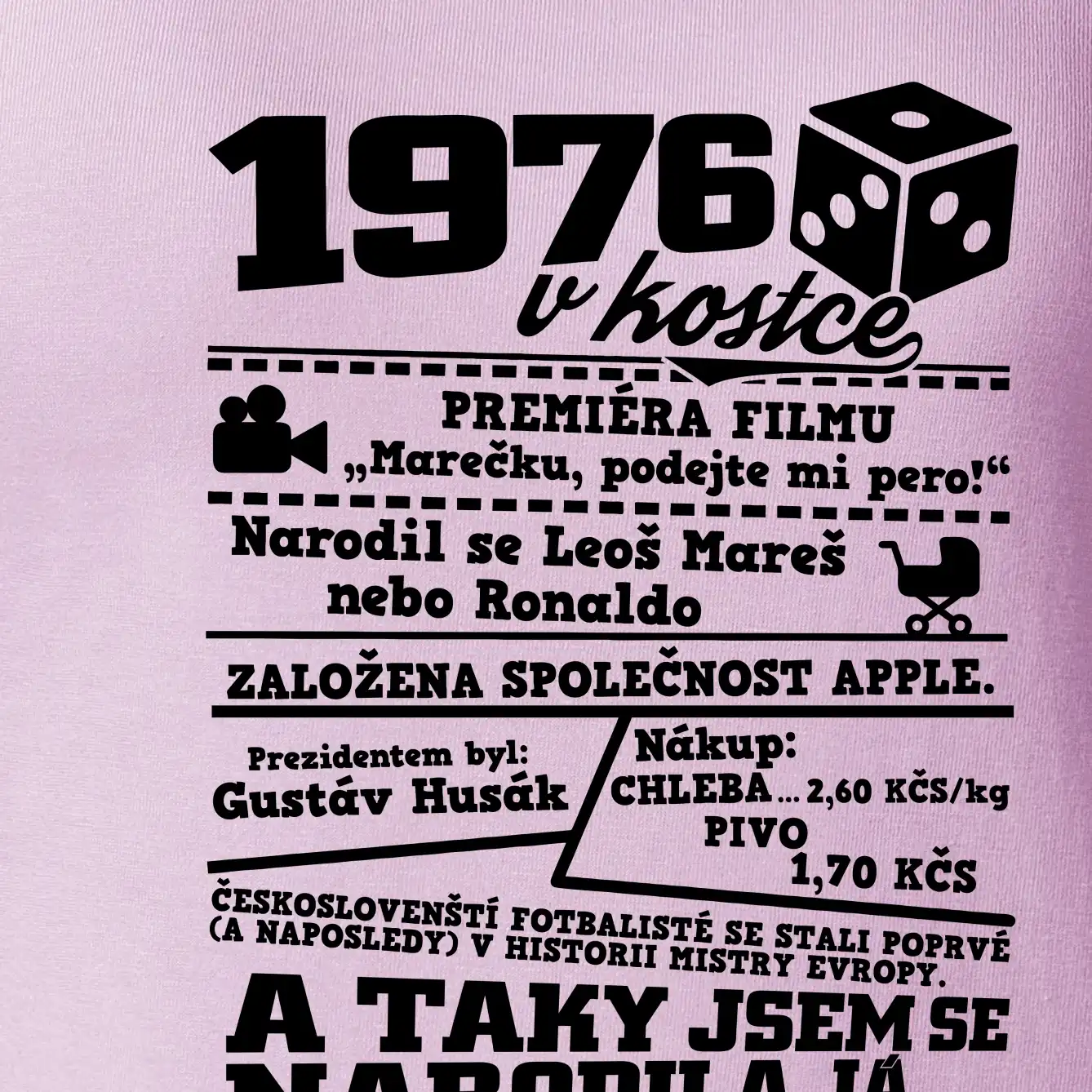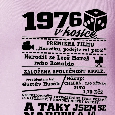 Narozeninové tričko pro ročník 1976. Sháníš originální dárek? Triko pro ročník 1976 v kostce je ten nejlepší dárek, kterým jistě potěšíš. Kolik co stálo? Kdo byl prezident? Kdo se narodil? Všechno tohle a ještě mnohem víc najdeš na našem oslaveneckém triku!