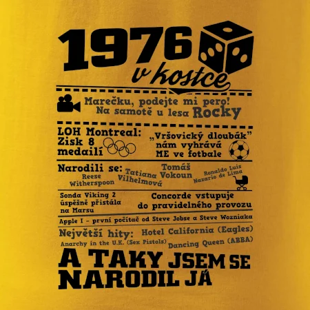 Narozeninové tričko pro ročník 1976. Sháníš originální dárek? Triko pro ročník 1976 v kostce je ten nejlepší dárek, kterým jistě potěšíš. Kolik co stálo? Kdo byl prezident? Kdo se narodil? Všechno tohle a ještě mnohem víc najdeš na našem oslaveneckém triku!