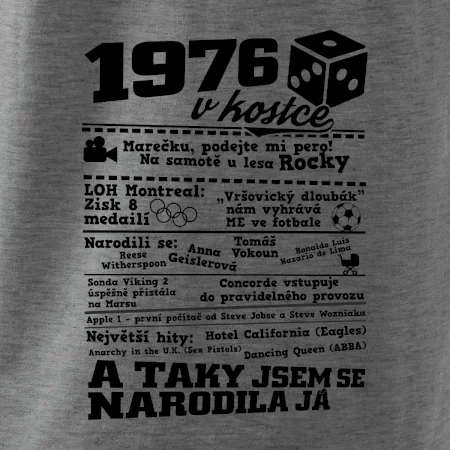 Narozeninové tričko pro ročník 1976. Sháníš originální dárek? Triko pro ročník 1976 v kostce je ten nejlepší dárek, kterým jistě potěšíš. Kolik co stálo? Kdo byl prezident? Kdo se narodil? Všechno tohle a ještě mnohem víc najdeš na našem oslaveneckém triku!