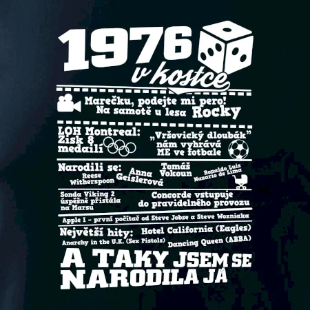 Narozeninové tričko pro ročník 1976. Sháníš originální dárek? Triko pro ročník 1976 v kostce je ten nejlepší dárek, kterým jistě potěšíš. Kolik co stálo? Kdo byl prezident? Kdo se narodil? Všechno tohle a ještě mnohem víc najdeš na našem oslaveneckém triku!