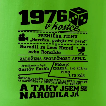 Narozeninové tričko pro ročník 1976. Sháníš originální dárek? Triko pro ročník 1976 v kostce je ten nejlepší dárek, kterým jistě potěšíš. Kolik co stálo? Kdo byl prezident? Kdo se narodil? Všechno tohle a ještě mnohem víc najdeš na našem oslaveneckém triku!