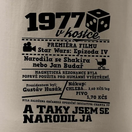 Narozeninové tričko pro ročník 1977. Sháníš originální dárek? Triko pro ročník 1977 v kostce je ten nejlepší dárek, kterým jistě potěšíš. Kolik co stálo? Kdo byl prezident? Kdo se narodil? Všechno tohle a ještě mnohem víc najdeš na našem oslaveneckém triku!