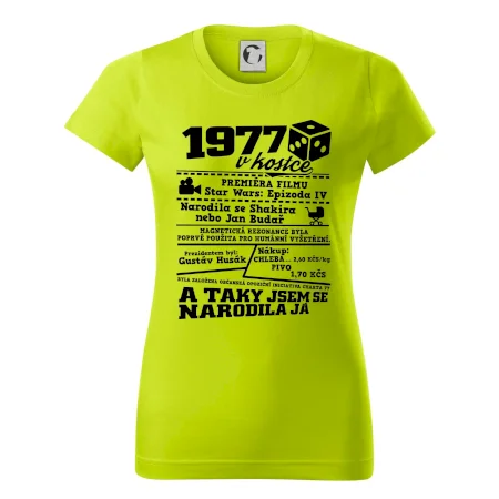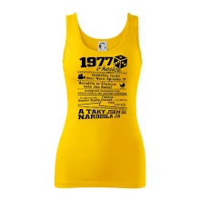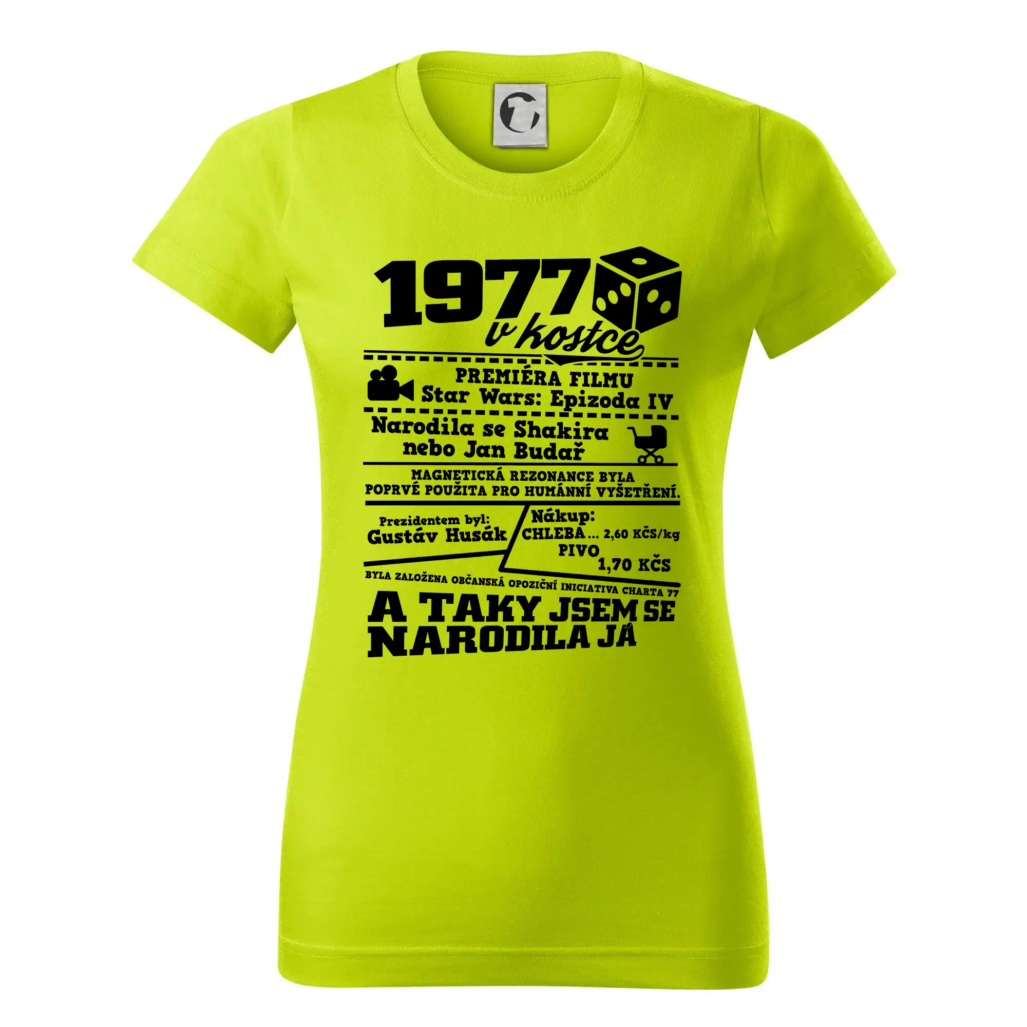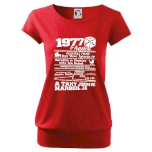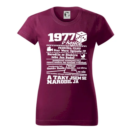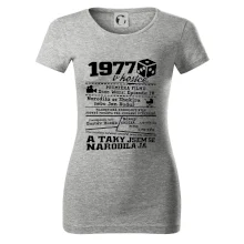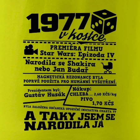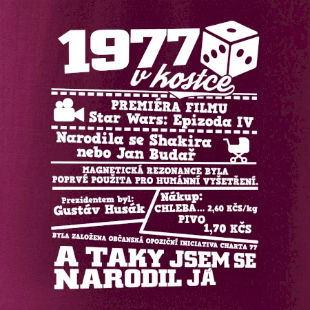 Narozeninové tričko pro ročník 1977. Sháníš originální dárek? Triko pro ročník 1977 v kostce je ten nejlepší dárek, kterým jistě potěšíš. Kolik co stálo? Kdo byl prezident? Kdo se narodil? Všechno tohle a ještě mnohem víc najdeš na našem oslaveneckém triku!