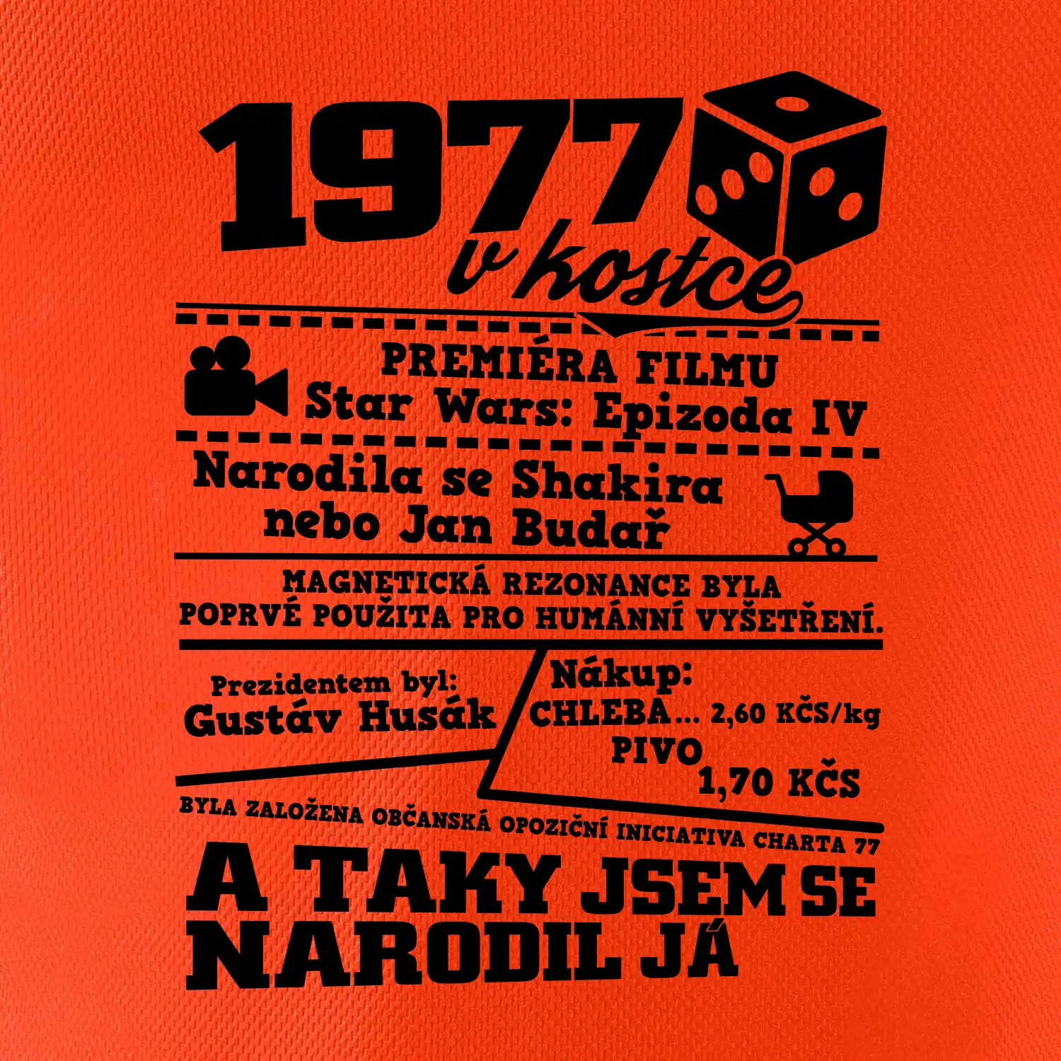 Narozeninové tričko pro ročník 1977. Sháníš originální dárek? Triko pro ročník 1977 v kostce je ten nejlepší dárek, kterým jistě potěšíš. Kolik co stálo? Kdo byl prezident? Kdo se narodil? Všechno tohle a ještě mnohem víc najdeš na našem oslaveneckém triku!