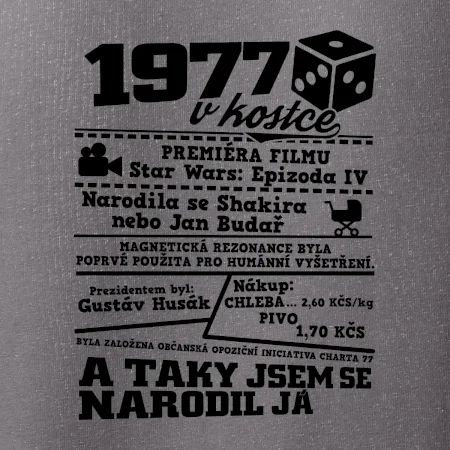 Narozeninové tričko pro ročník 1977. Sháníš originální dárek? Triko pro ročník 1977 v kostce je ten nejlepší dárek, kterým jistě potěšíš. Kolik co stálo? Kdo byl prezident? Kdo se narodil? Všechno tohle a ještě mnohem víc najdeš na našem oslaveneckém triku!