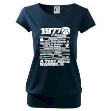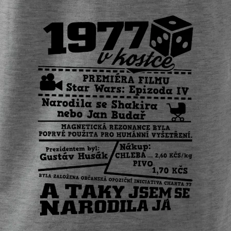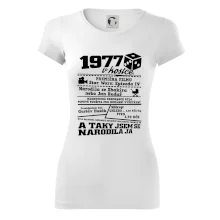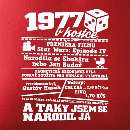 Narozeninové tričko pro ročník 1977. Sháníš originální dárek? Triko pro ročník 1977 v kostce je ten nejlepší dárek, kterým jistě potěšíš. Kolik co stálo? Kdo byl prezident? Kdo se narodil? Všechno tohle a ještě mnohem víc najdeš na našem oslaveneckém triku!