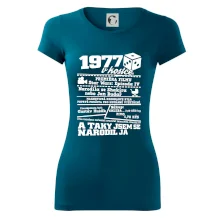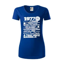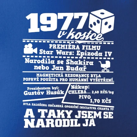 Narozeninové tričko pro ročník 1977. Sháníš originální dárek? Triko pro ročník 1977 v kostce je ten nejlepší dárek, kterým jistě potěšíš. Kolik co stálo? Kdo byl prezident? Kdo se narodil? Všechno tohle a ještě mnohem víc najdeš na našem oslaveneckém triku!