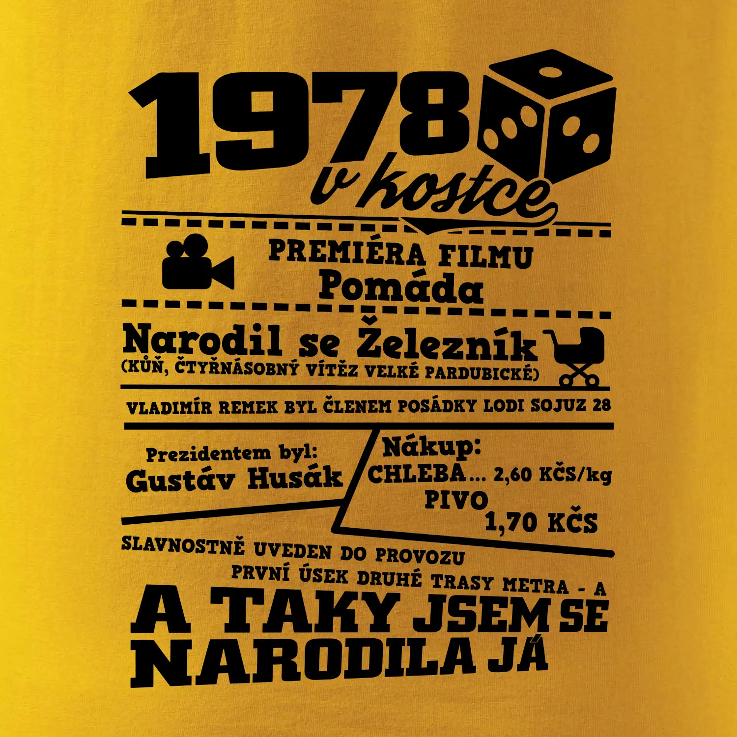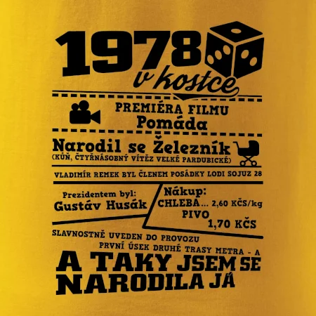 Narozeninové tričko pro ročník 1978. Sháníš originální dárek? Triko pro ročník 1978 v kostce je ten nejlepší dárek, kterým jistě potěšíš. Kolik co stálo? Kdo byl prezident? Kdo se narodil? Všechno tohle a ještě mnohem víc najdeš na našem oslaveneckém triku!