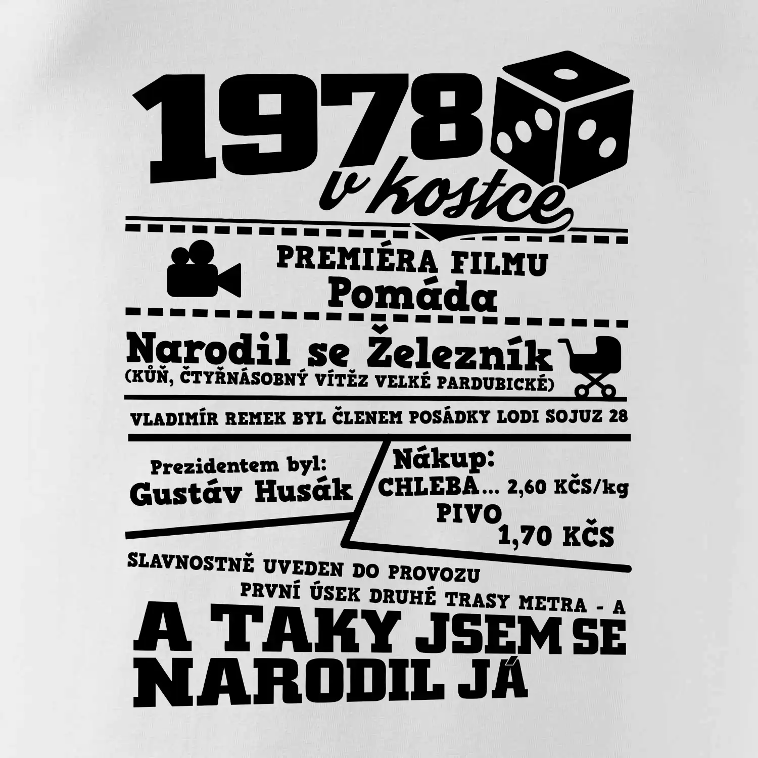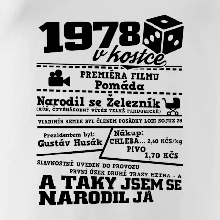 Narozeninové tričko pro ročník 1978. Sháníš originální dárek? Triko pro ročník 1978 v kostce je ten nejlepší dárek, kterým jistě potěšíš. Kolik co stálo? Kdo byl prezident? Kdo se narodil? Všechno tohle a ještě mnohem víc najdeš na našem oslaveneckém triku!