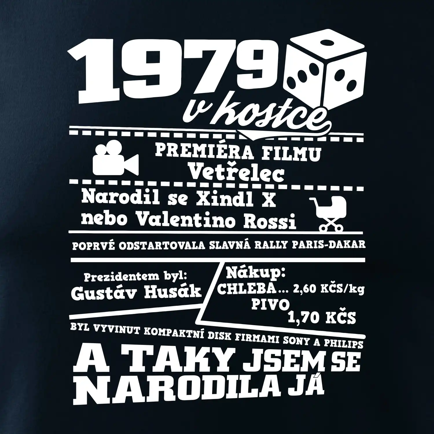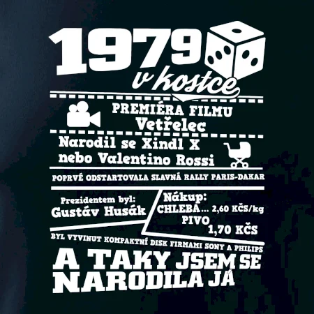 Narozeninové tričko pro ročník 1979. Sháníš originální dárek? Triko pro ročník 1979 v kostce je ten nejlepší dárek, kterým jistě potěšíš. Kolik co stálo? Kdo byl prezident? Kdo se narodil? Všechno tohle a ještě mnohem víc najdeš na našem oslaveneckém triku!