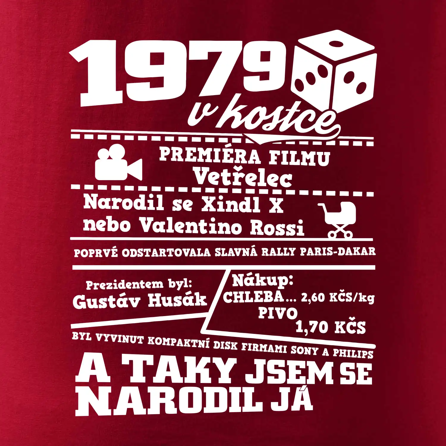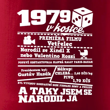 Narozeninové tričko pro ročník 1979. Sháníš originální dárek? Triko pro ročník 1979 v kostce je ten nejlepší dárek, kterým jistě potěšíš. Kolik co stálo? Kdo byl prezident? Kdo se narodil? Všechno tohle a ještě mnohem víc najdeš na našem oslaveneckém triku!