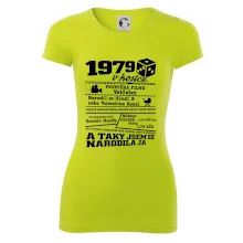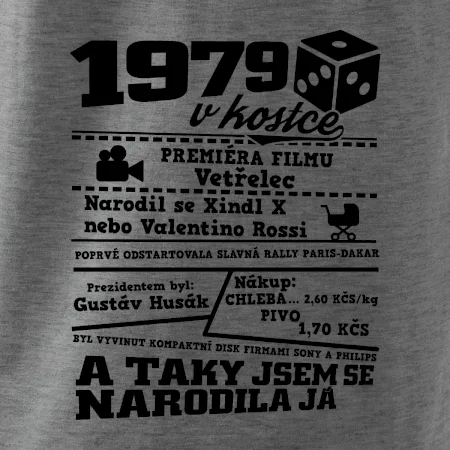 Narozeninové tričko pro ročník 1979. Sháníš originální dárek? Triko pro ročník 1979 v kostce je ten nejlepší dárek, kterým jistě potěšíš. Kolik co stálo? Kdo byl prezident? Kdo se narodil? Všechno tohle a ještě mnohem víc najdeš na našem oslaveneckém triku!