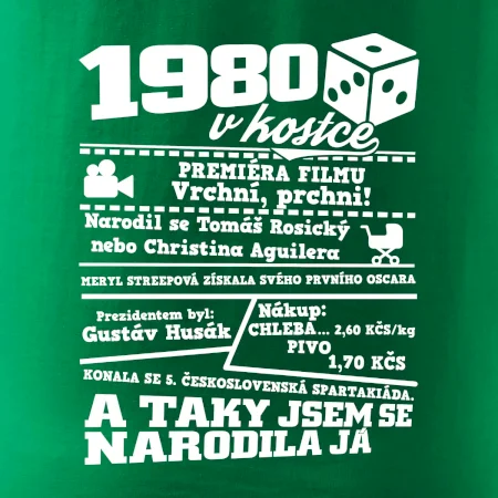 Narozeninové tričko pro ročník 1980. Sháníš originální dárek? Triko pro ročník 1980 v kostce je ten nejlepší dárek, kterým jistě potěšíš. Kolik co stálo? Kdo byl prezident? Kdo se narodil? Všechno tohle a ještě mnohem víc najdeš na našem oslaveneckém triku!