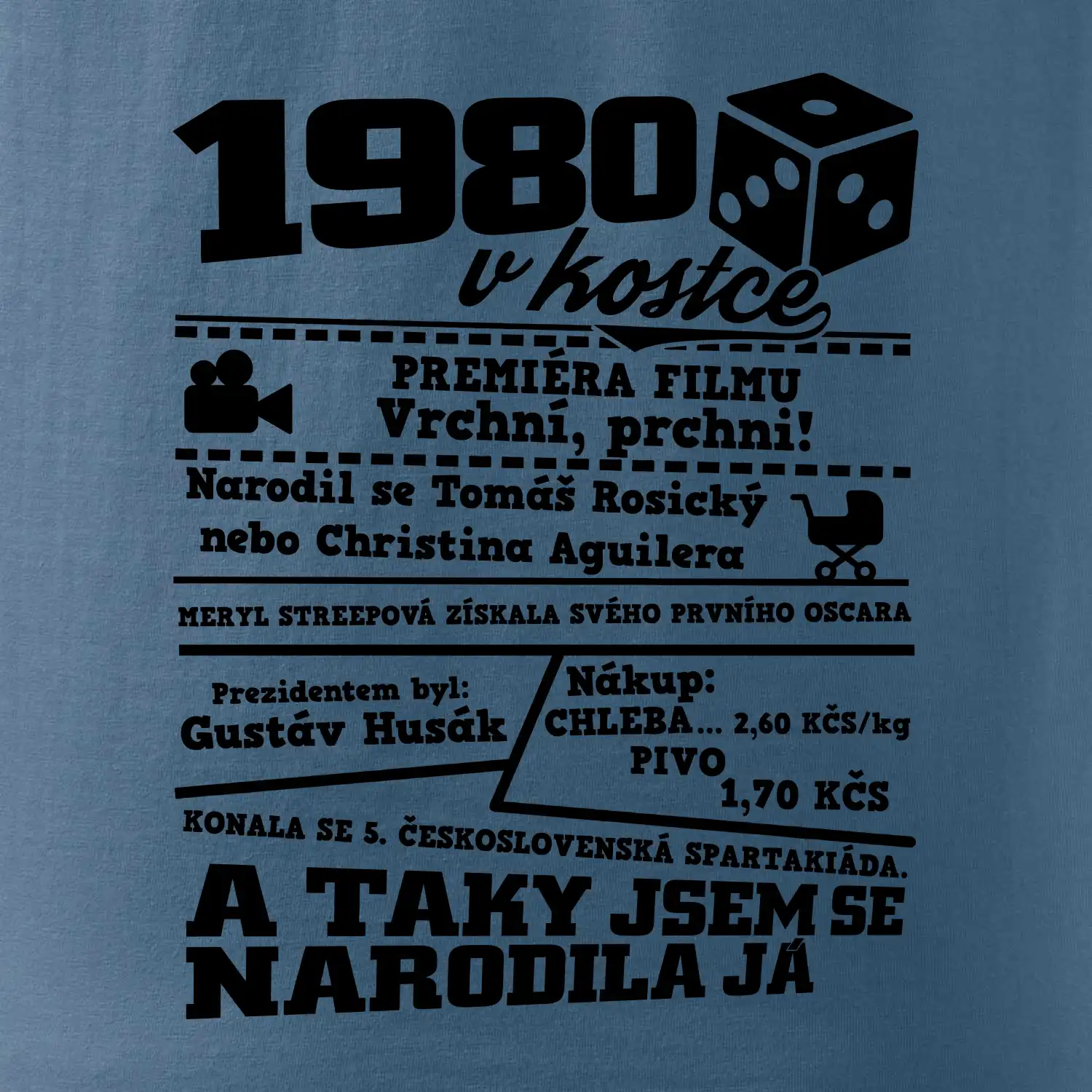 Narozeninové tričko pro ročník 1980. Sháníš originální dárek? Triko pro ročník 1980 v kostce je ten nejlepší dárek, kterým jistě potěšíš. Kolik co stálo? Kdo byl prezident? Kdo se narodil? Všechno tohle a ještě mnohem víc najdeš na našem oslaveneckém triku!