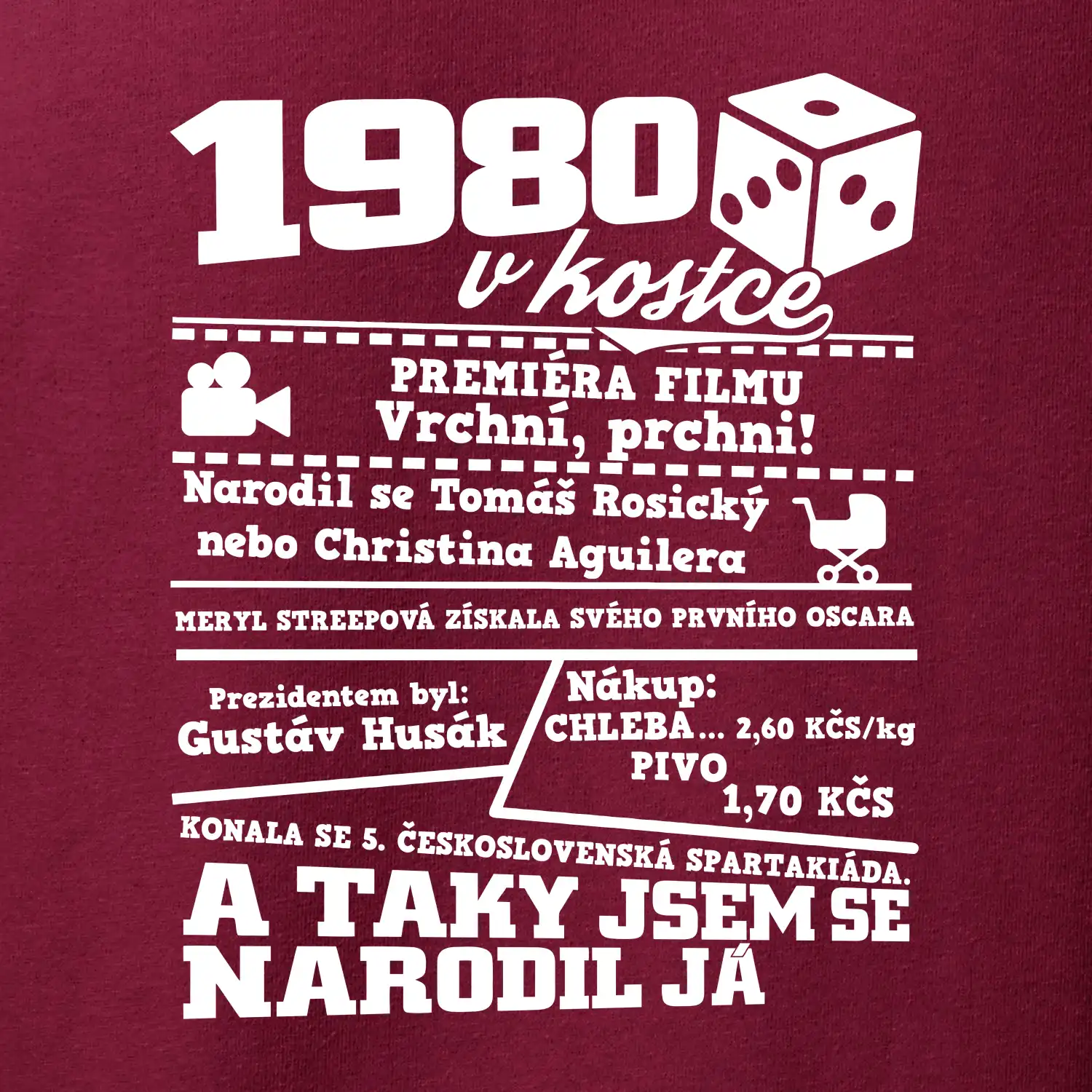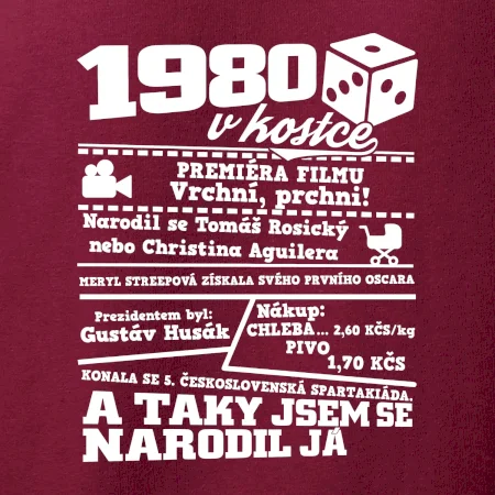 Narozeninové tričko pro ročník 1980. Sháníš originální dárek? Triko pro ročník 1980 v kostce je ten nejlepší dárek, kterým jistě potěšíš. Kolik co stálo? Kdo byl prezident? Kdo se narodil? Všechno tohle a ještě mnohem víc najdeš na našem oslaveneckém triku!