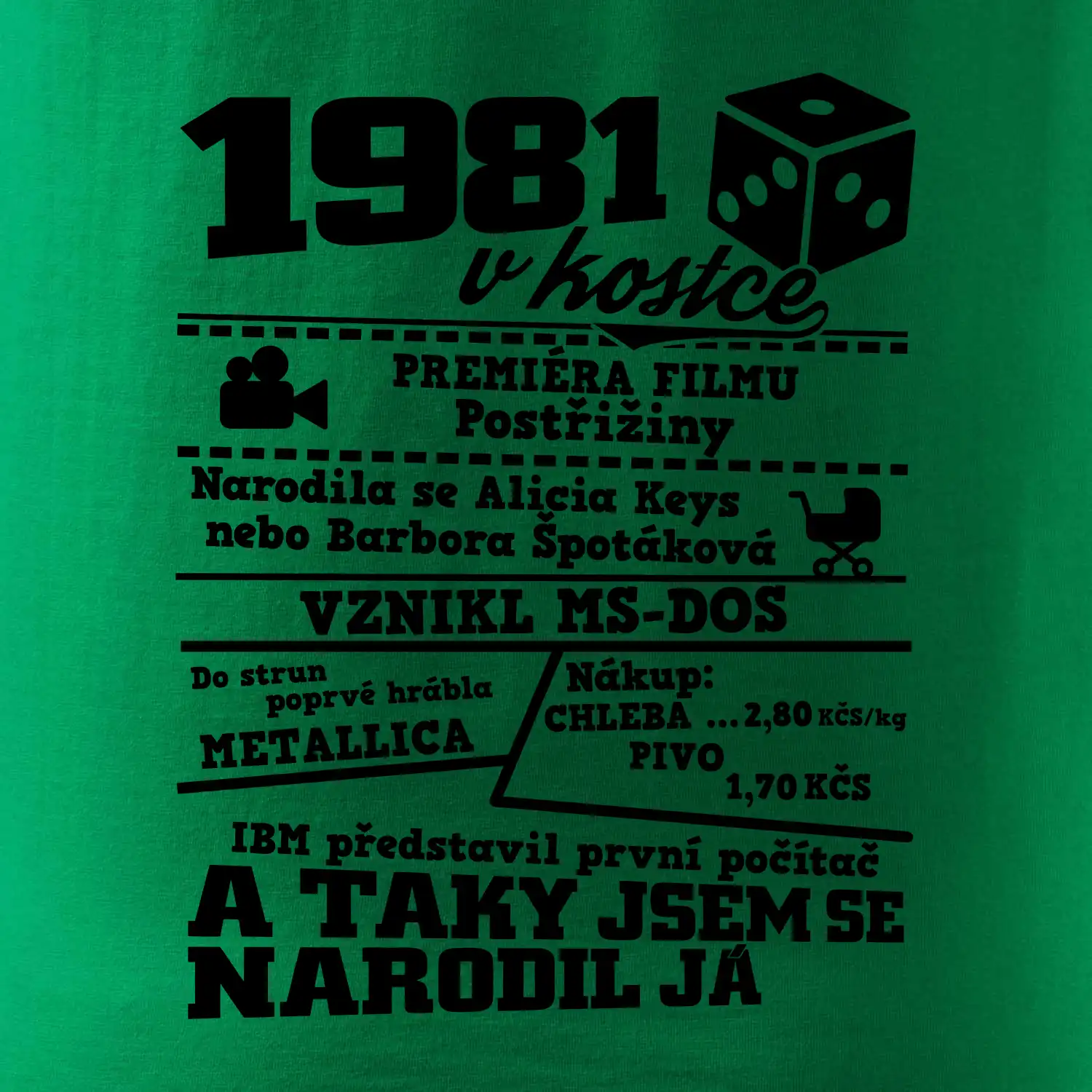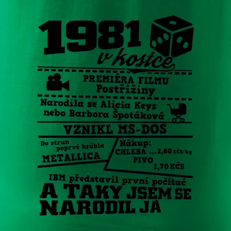 Narozeninové tričko pro ročník 1981. Sháníš originální dárek? Triko pro ročník 1981 v kostce je ten nejlepší dárek, kterým jistě potěšíš. Kolik co stálo? Kdo byl prezident? Kdo se narodil? Všechno tohle a ještě mnohem víc najdeš na našem oslaveneckém triku!