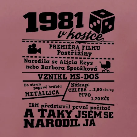 Narozeninové tričko pro ročník 1981. Sháníš originální dárek? Triko pro ročník 1981 v kostce je ten nejlepší dárek, kterým jistě potěšíš. Kolik co stálo? Kdo byl prezident? Kdo se narodil? Všechno tohle a ještě mnohem víc najdeš na našem oslaveneckém triku!