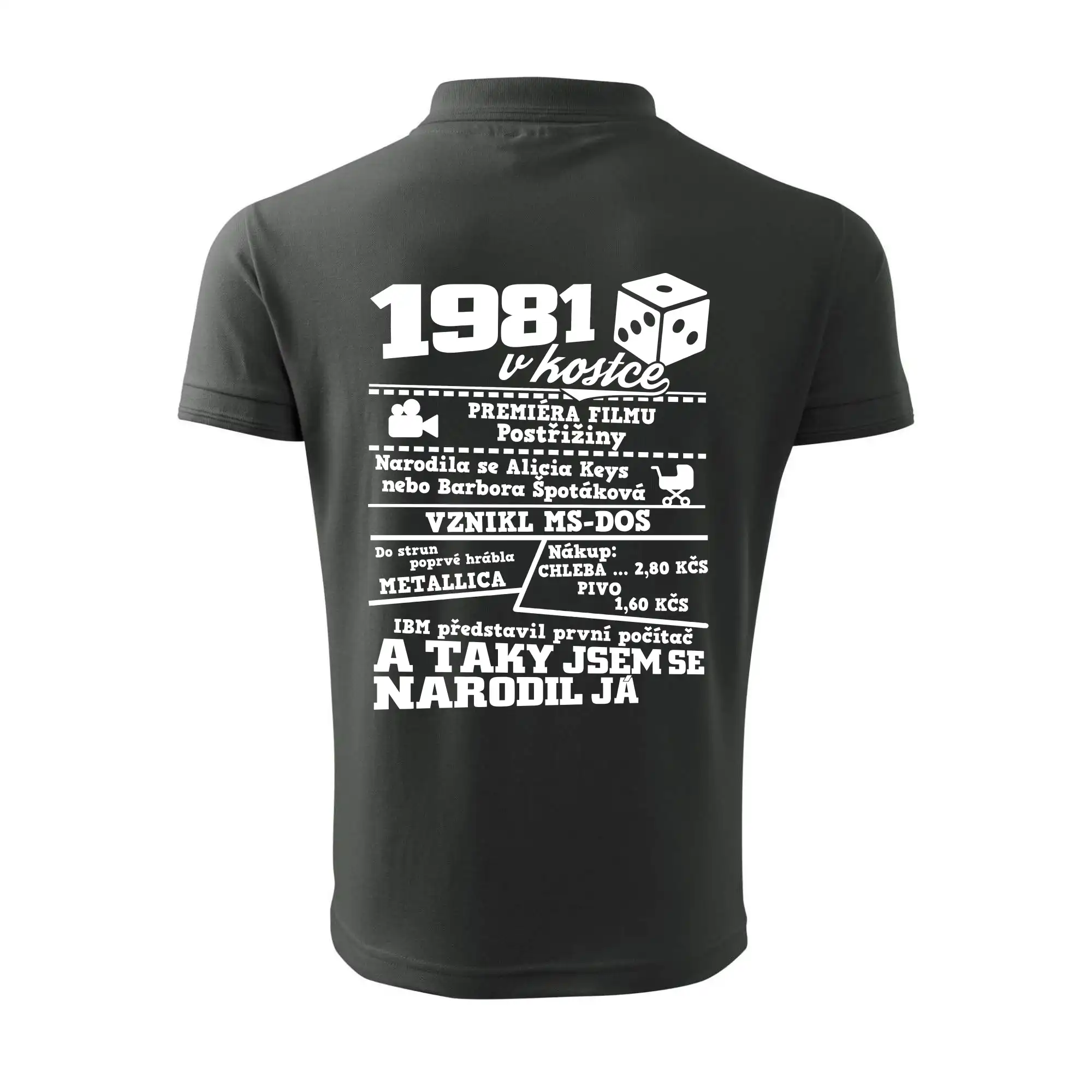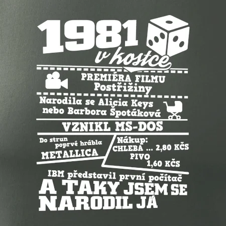 Narozeninové tričko pro ročník 1981. Sháníš originální dárek? Triko pro ročník 1981 v kostce je ten nejlepší dárek, kterým jistě potěšíš. Kolik co stálo? Kdo byl prezident? Kdo se narodil? Všechno tohle a ještě mnohem víc najdeš na našem oslaveneckém triku!