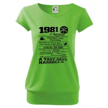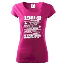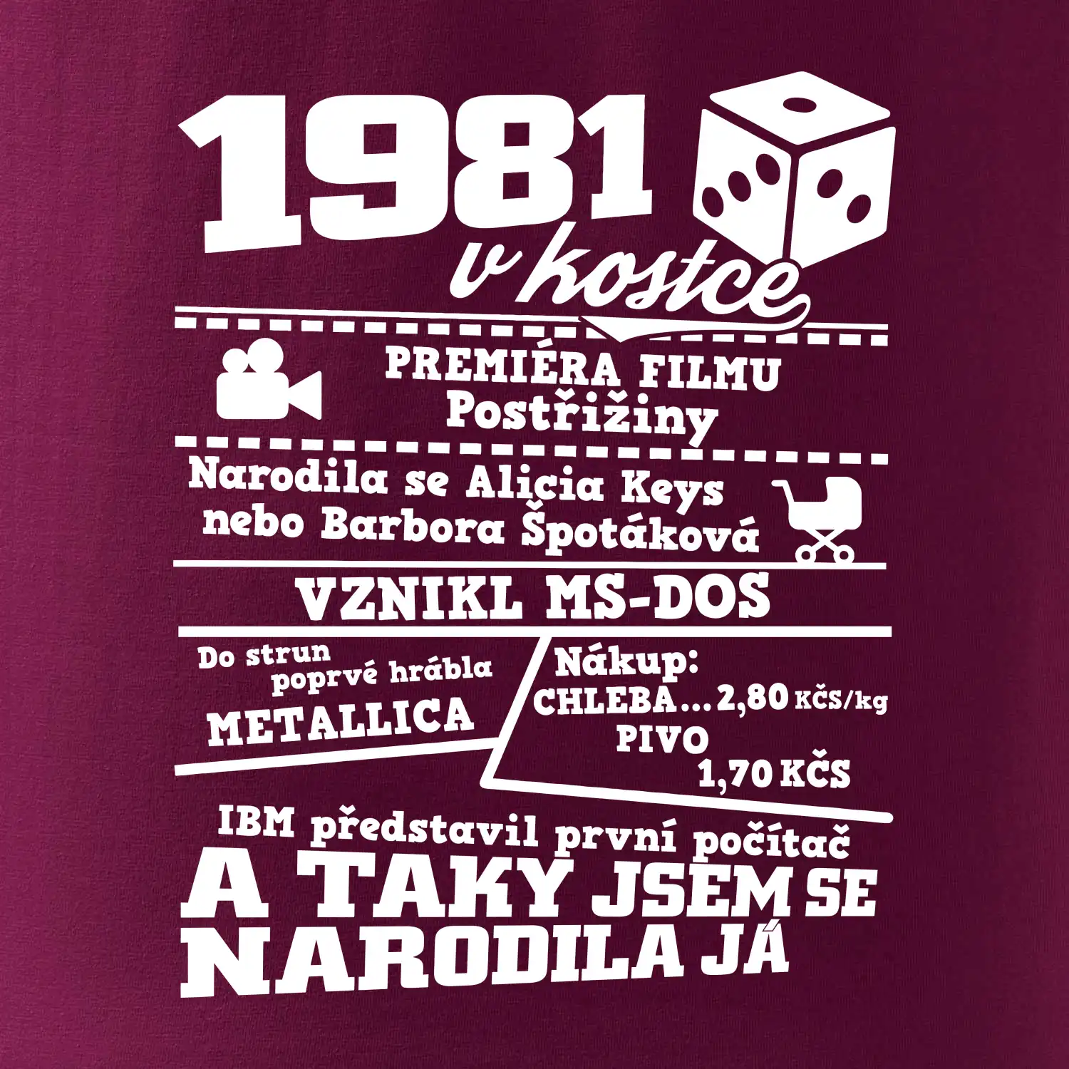 Narozeninové tričko pro ročník 1981. Sháníš originální dárek? Triko pro ročník 1981 v kostce je ten nejlepší dárek, kterým jistě potěšíš. Kolik co stálo? Kdo byl prezident? Kdo se narodil? Všechno tohle a ještě mnohem víc najdeš na našem oslaveneckém triku!