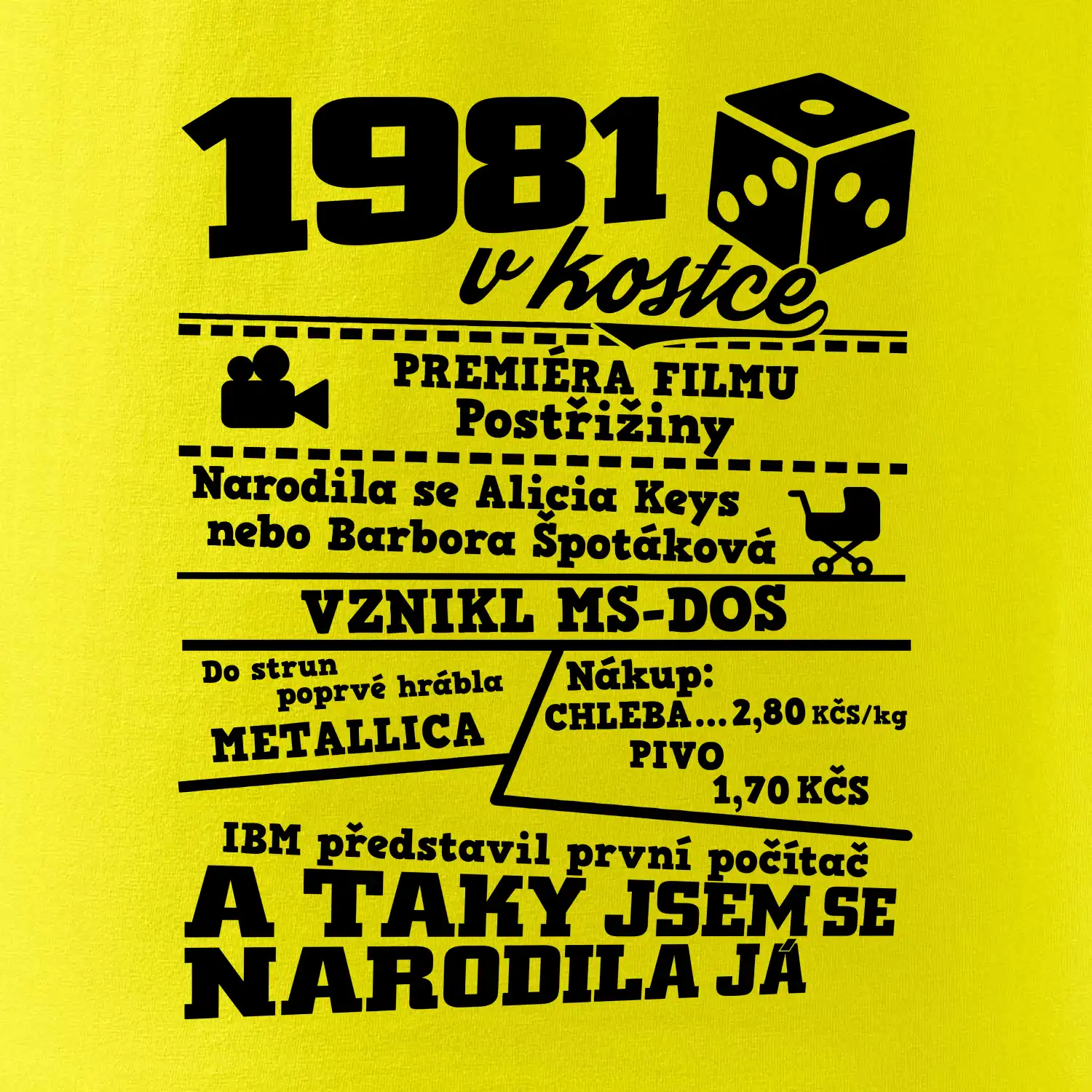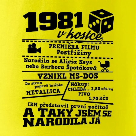 Narozeninové tričko pro ročník 1981. Sháníš originální dárek? Triko pro ročník 1981 v kostce je ten nejlepší dárek, kterým jistě potěšíš. Kolik co stálo? Kdo byl prezident? Kdo se narodil? Všechno tohle a ještě mnohem víc najdeš na našem oslaveneckém triku!