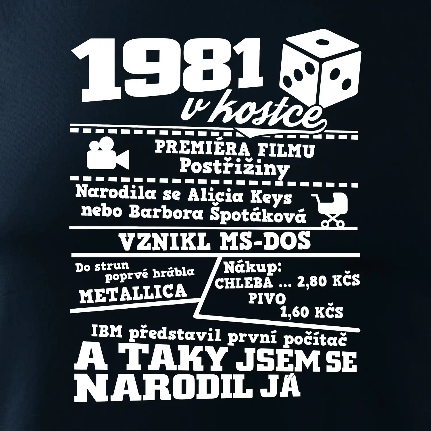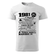 Narozeninové tričko pro ročník 1981. Sháníš originální dárek? Triko pro ročník 1981 v kostce je ten nejlepší dárek, kterým jistě potěšíš. Kolik co stálo? Kdo byl prezident? Kdo se narodil? Všechno tohle a ještě mnohem víc najdeš na našem oslaveneckém triku!
