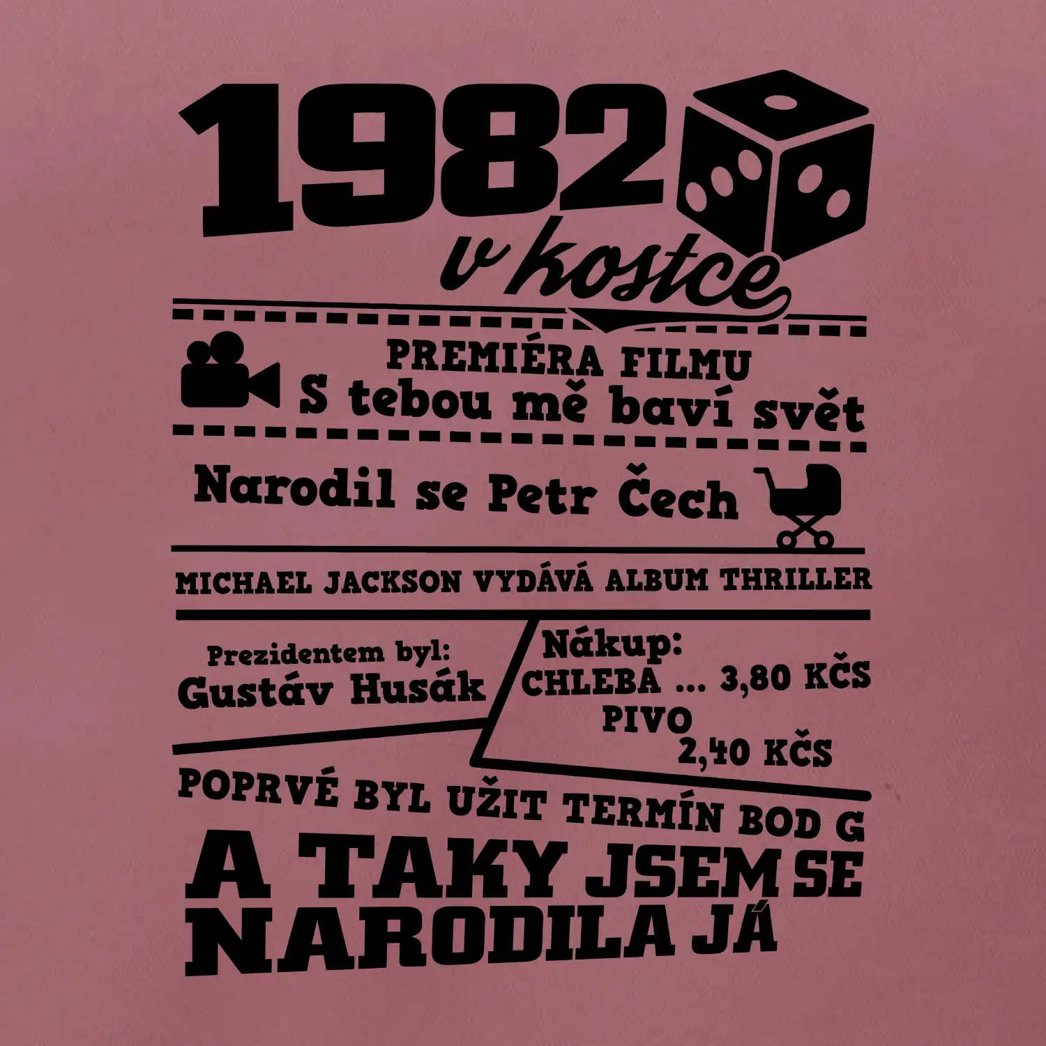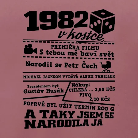 Narozeninové tričko pro ročník 1982. Sháníš originální dárek? Triko pro ročník 1982 v kostce je ten nejlepší dárek, kterým jistě potěšíš. Kolik co stálo? Kdo byl prezident? Kdo se narodil? Všechno tohle a ještě mnohem víc najdeš na našem oslaveneckém triku!