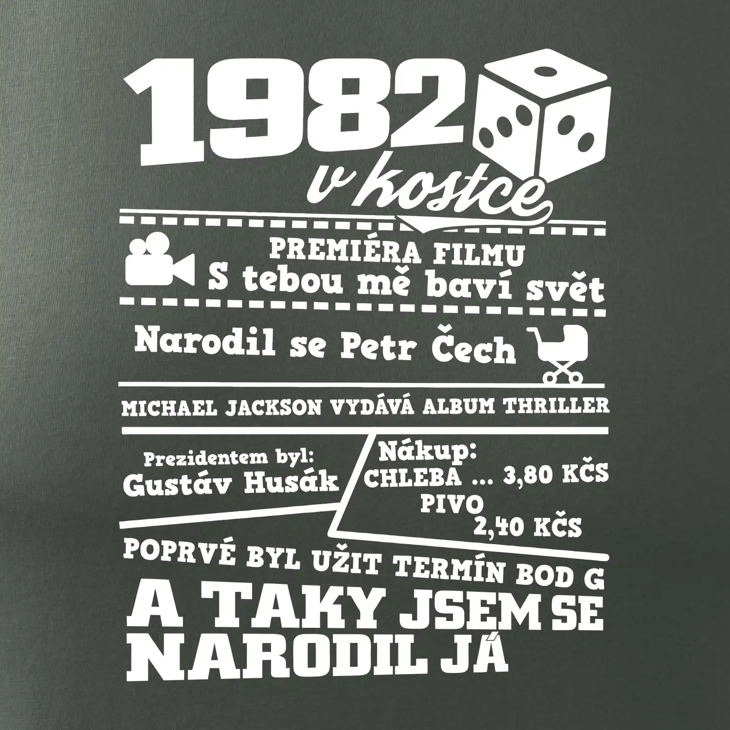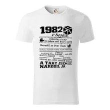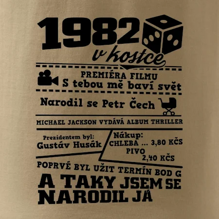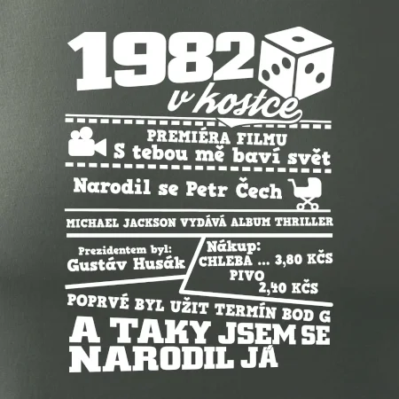 Narozeninové tričko pro ročník 1982. Sháníš originální dárek? Triko pro ročník 1982 v kostce je ten nejlepší dárek, kterým jistě potěšíš. Kolik co stálo? Kdo byl prezident? Kdo se narodil? Všechno tohle a ještě mnohem víc najdeš na našem oslaveneckém triku!