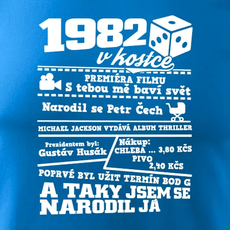 Narozeninové tričko pro ročník 1982. Sháníš originální dárek? Triko pro ročník 1982 v kostce je ten nejlepší dárek, kterým jistě potěšíš. Kolik co stálo? Kdo byl prezident? Kdo se narodil? Všechno tohle a ještě mnohem víc najdeš na našem oslaveneckém triku!