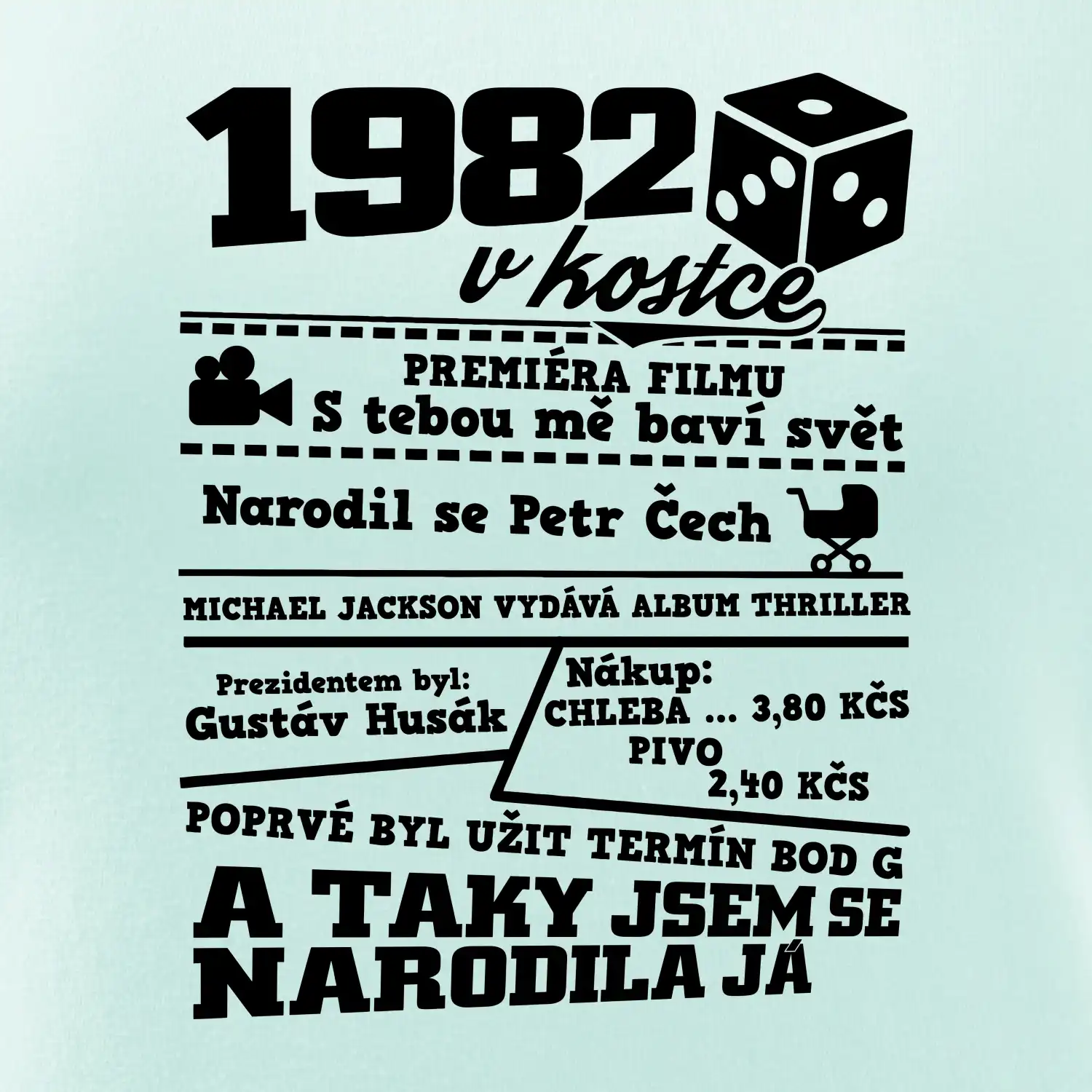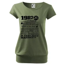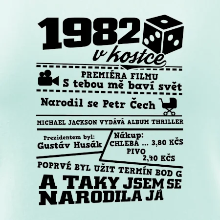 Narozeninové tričko pro ročník 1982. Sháníš originální dárek? Triko pro ročník 1982 v kostce je ten nejlepší dárek, kterým jistě potěšíš. Kolik co stálo? Kdo byl prezident? Kdo se narodil? Všechno tohle a ještě mnohem víc najdeš na našem oslaveneckém triku!