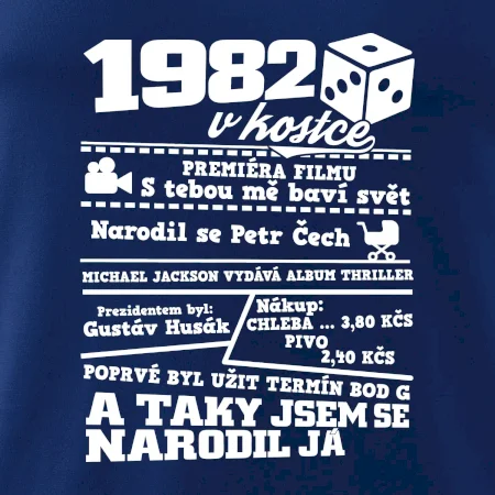 Narozeninové tričko pro ročník 1982. Sháníš originální dárek? Triko pro ročník 1982 v kostce je ten nejlepší dárek, kterým jistě potěšíš. Kolik co stálo? Kdo byl prezident? Kdo se narodil? Všechno tohle a ještě mnohem víc najdeš na našem oslaveneckém triku!