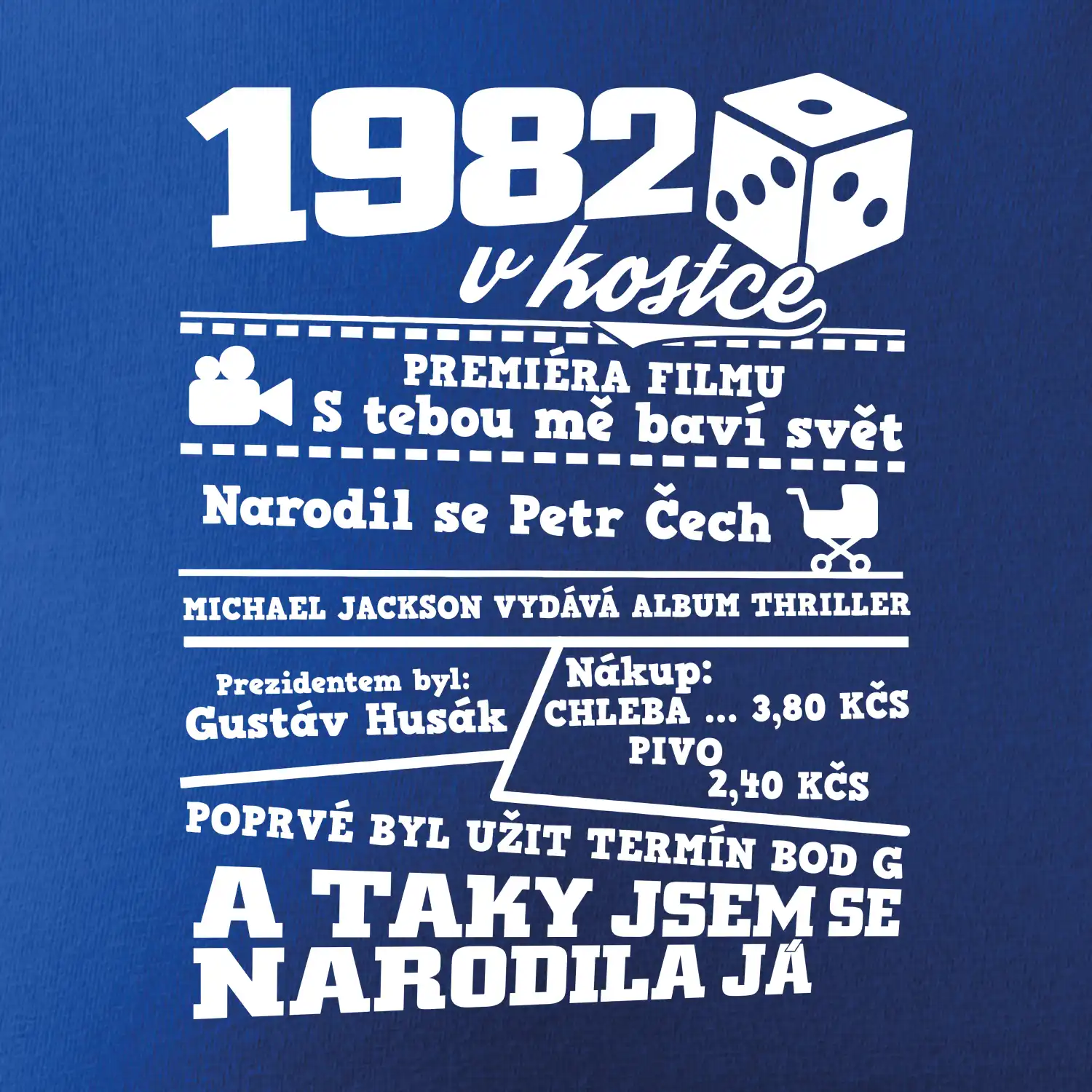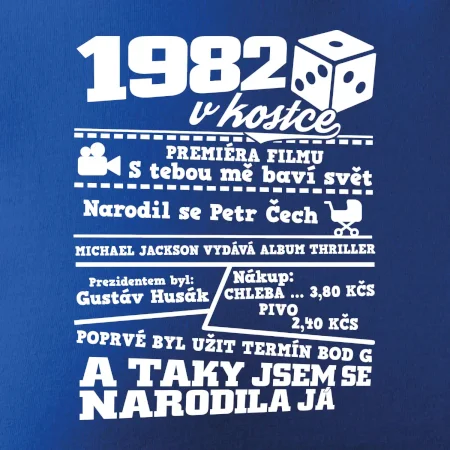 Narozeninové tričko pro ročník 1982. Sháníš originální dárek? Triko pro ročník 1982 v kostce je ten nejlepší dárek, kterým jistě potěšíš. Kolik co stálo? Kdo byl prezident? Kdo se narodil? Všechno tohle a ještě mnohem víc najdeš na našem oslaveneckém triku!