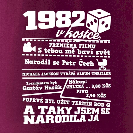 Narozeninové tričko pro ročník 1982. Sháníš originální dárek? Triko pro ročník 1982 v kostce je ten nejlepší dárek, kterým jistě potěšíš. Kolik co stálo? Kdo byl prezident? Kdo se narodil? Všechno tohle a ještě mnohem víc najdeš na našem oslaveneckém triku!