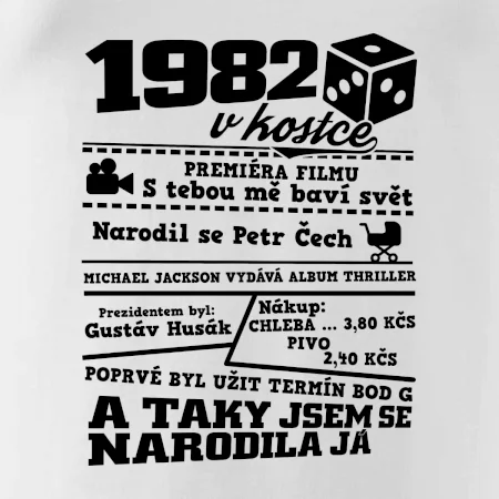 Narozeninové tričko pro ročník 1982. Sháníš originální dárek? Triko pro ročník 1982 v kostce je ten nejlepší dárek, kterým jistě potěšíš. Kolik co stálo? Kdo byl prezident? Kdo se narodil? Všechno tohle a ještě mnohem víc najdeš na našem oslaveneckém triku!