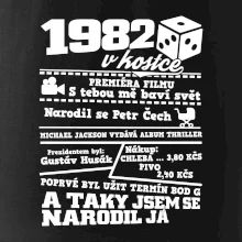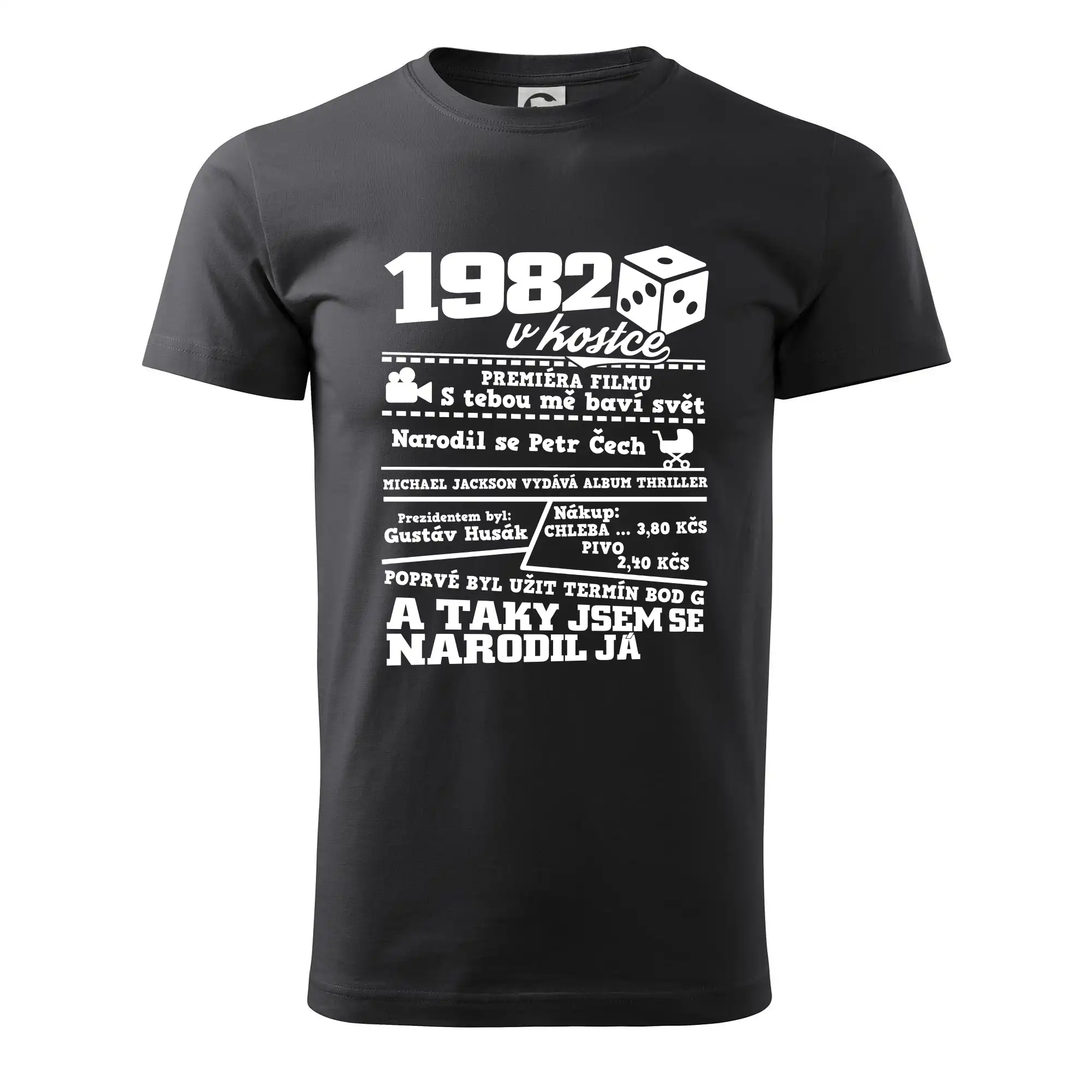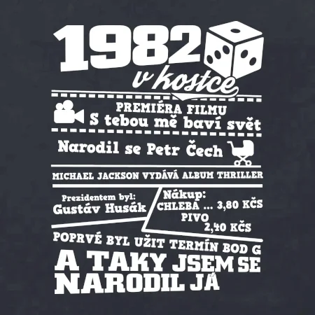 Narozeninové tričko pro ročník 1982. Sháníš originální dárek? Triko pro ročník 1982 v kostce je ten nejlepší dárek, kterým jistě potěšíš. Kolik co stálo? Kdo byl prezident? Kdo se narodil? Všechno tohle a ještě mnohem víc najdeš na našem oslaveneckém triku!
