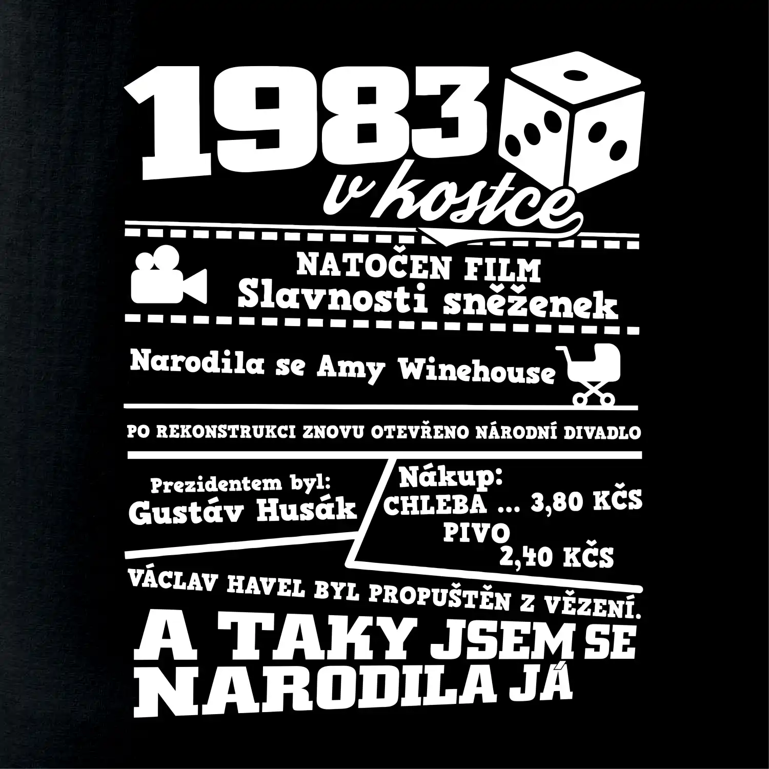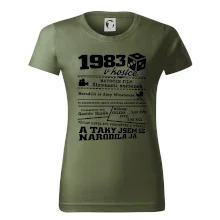 Narozeninové tričko pro ročník 1983. Sháníš originální dárek? Triko pro ročník 1983 v kostce je ten nejlepší dárek, kterým jistě potěšíš. Kolik co stálo? Kdo byl prezident? Kdo se narodil? Všechno tohle a ještě mnohem víc najdeš na našem oslaveneckém triku!