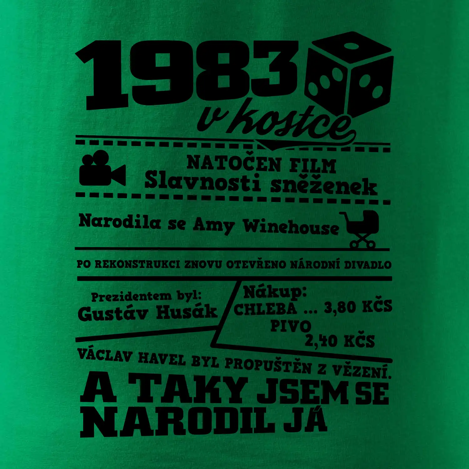 Narozeninové tričko pro ročník 1983. Sháníš originální dárek? Triko pro ročník 1983 v kostce je ten nejlepší dárek, kterým jistě potěšíš. Kolik co stálo? Kdo byl prezident? Kdo se narodil? Všechno tohle a ještě mnohem víc najdeš na našem oslaveneckém triku!