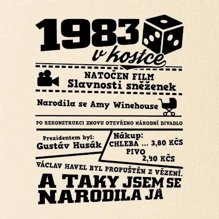 Narozeninové tričko pro ročník 1983. Sháníš originální dárek? Triko pro ročník 1983 v kostce je ten nejlepší dárek, kterým jistě potěšíš. Kolik co stálo? Kdo byl prezident? Kdo se narodil? Všechno tohle a ještě mnohem víc najdeš na našem oslaveneckém triku!