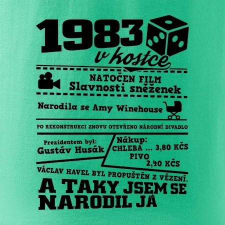 Narozeninové tričko pro ročník 1983. Sháníš originální dárek? Triko pro ročník 1983 v kostce je ten nejlepší dárek, kterým jistě potěšíš. Kolik co stálo? Kdo byl prezident? Kdo se narodil? Všechno tohle a ještě mnohem víc najdeš na našem oslaveneckém triku!