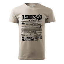 Narozeninové tričko pro ročník 1983. Sháníš originální dárek? Triko pro ročník 1983 v kostce je ten nejlepší dárek, kterým jistě potěšíš. Kolik co stálo? Kdo byl prezident? Kdo se narodil? Všechno tohle a ještě mnohem víc najdeš na našem oslaveneckém triku!