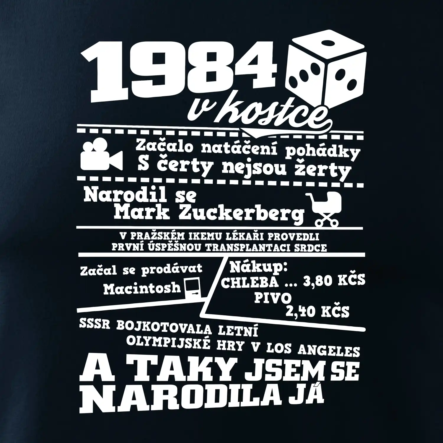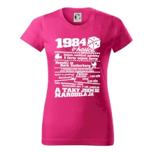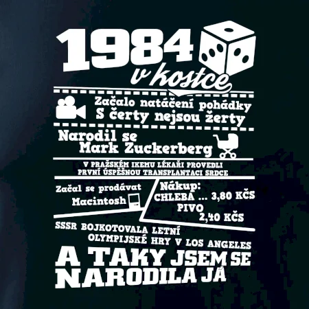 Narozeninové tričko pro ročník 1984. Sháníš originální dárek? Triko pro ročník 1984 v kostce je ten nejlepší dárek, kterým jistě potěšíš. Kolik co stálo? Kdo byl prezident? Kdo se narodil? Všechno tohle a ještě mnohem víc najdeš na našem oslaveneckém triku!